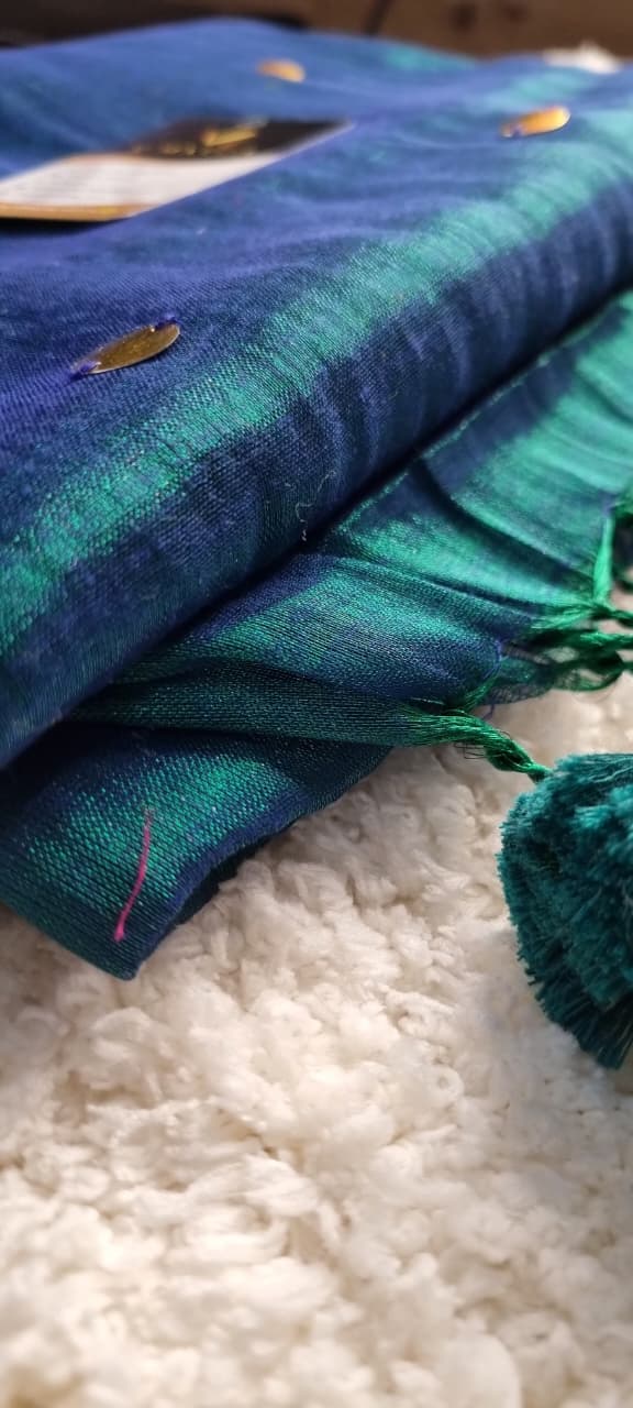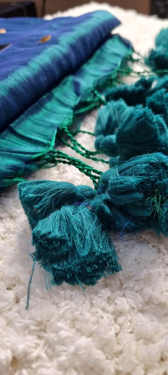 Exude elegance with our stunning Raga Tissue Saree in a mesmerizing blend of ocean blue and teal tones. Crafted from premium tissue fabric, it features a subtle shimmer and playful tassel detailing on the pallu. Lightweight and graceful — perfect for festive wear, parties, or special occasions.