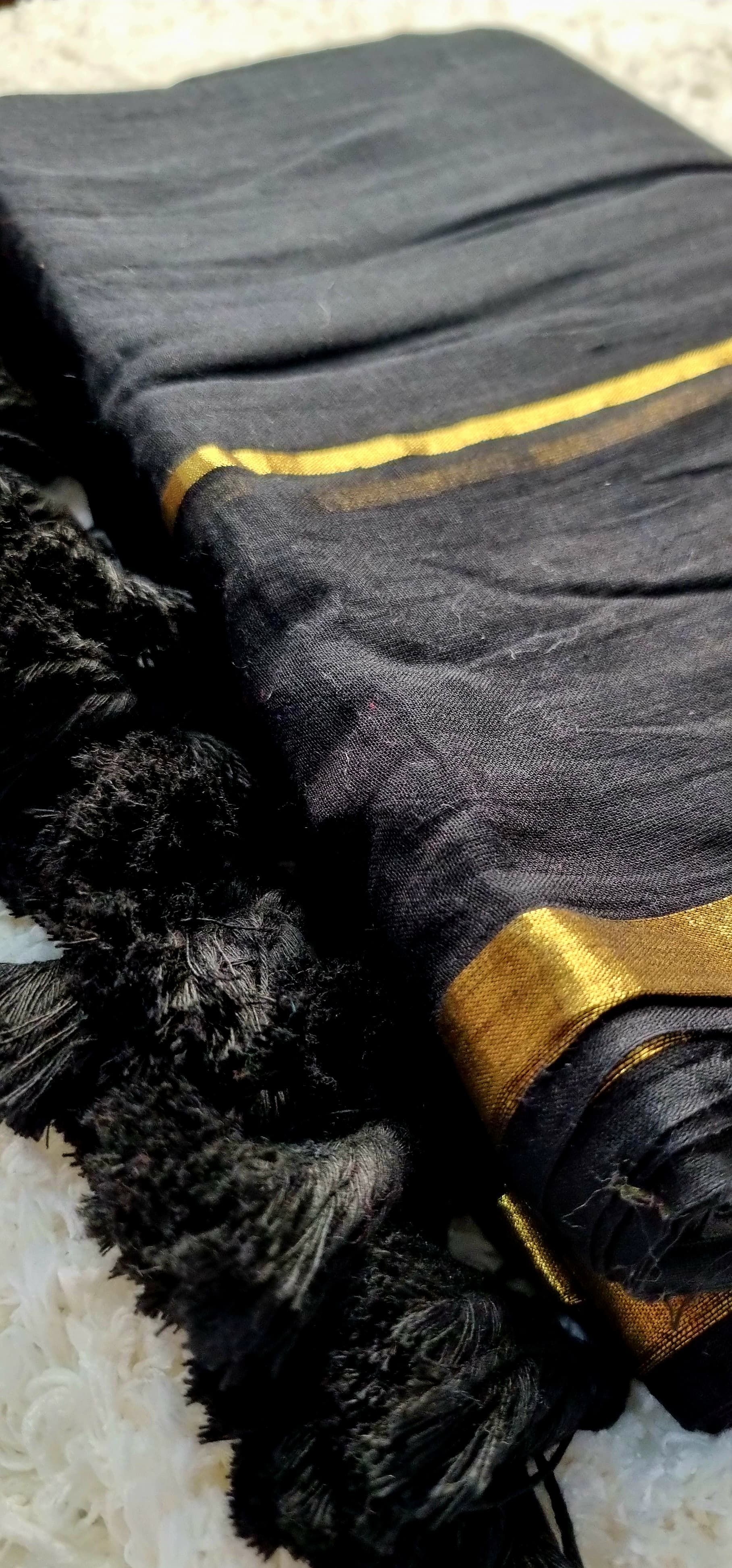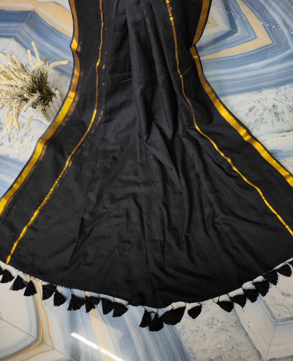 Indulge in the unparalleled luxury of our "Midnight Silk" Mul Cotton Saree, crafted with an exceptional 120-count yarn. This elevated thread count results in a fabric that is incredibly light, airy, and buttery-soft—offering the drape and feel of fine silk, yet maintaining the breathable comfort of pure cotton.