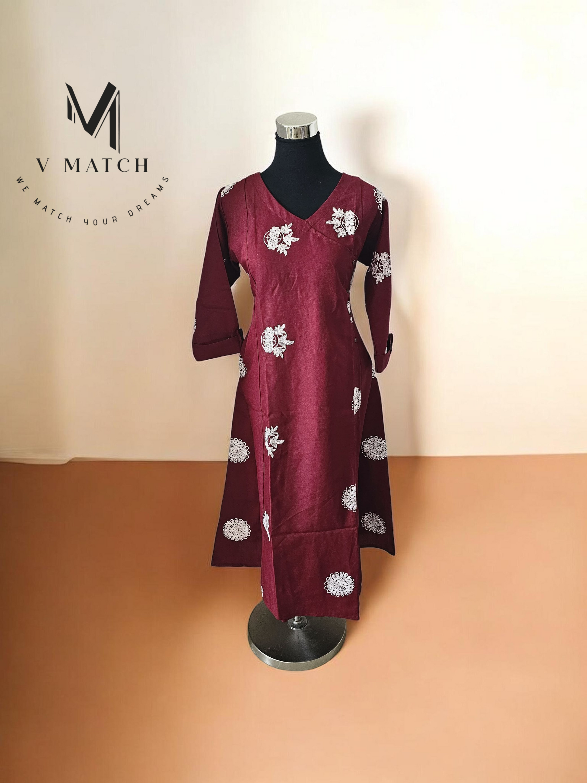 - Detailing: Adorned with intricate, snow-white floral embroidery that adds a touch of artisanal charm to the rich maroon base.