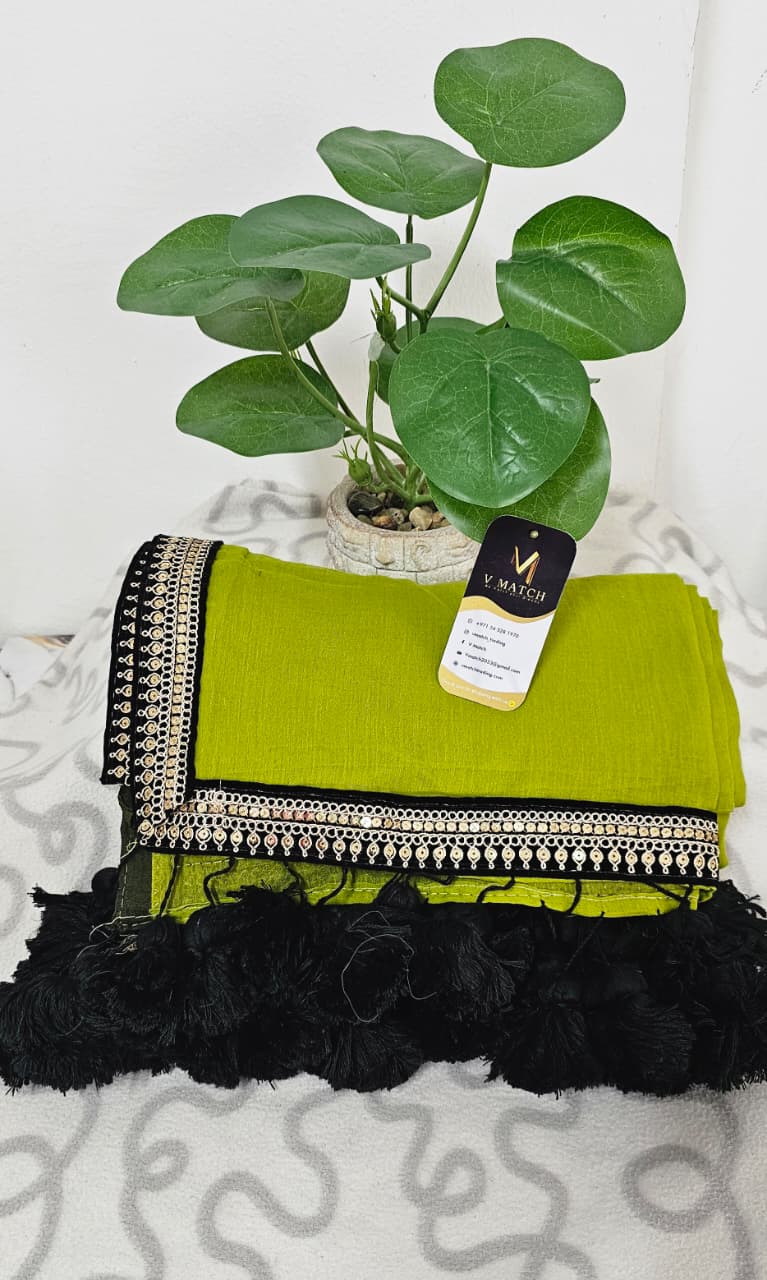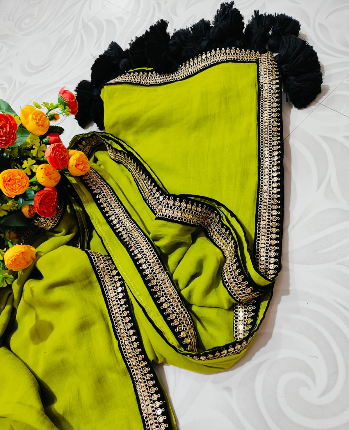 The striking Lime Green body sets a playful and energetic tone. The entire saree is framed by an elaborate and unique Multi Tilak Lace Border (incorporating the sequence/zari work visible in the image), which runs all the way around, adding a dazzling, festive sparkle.