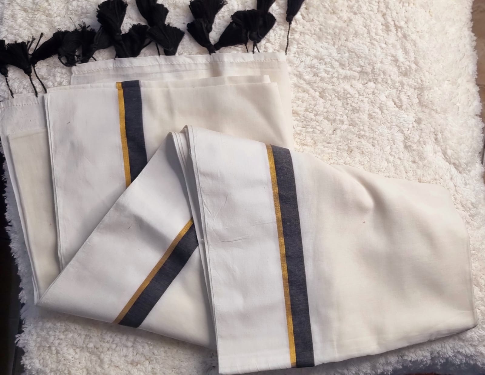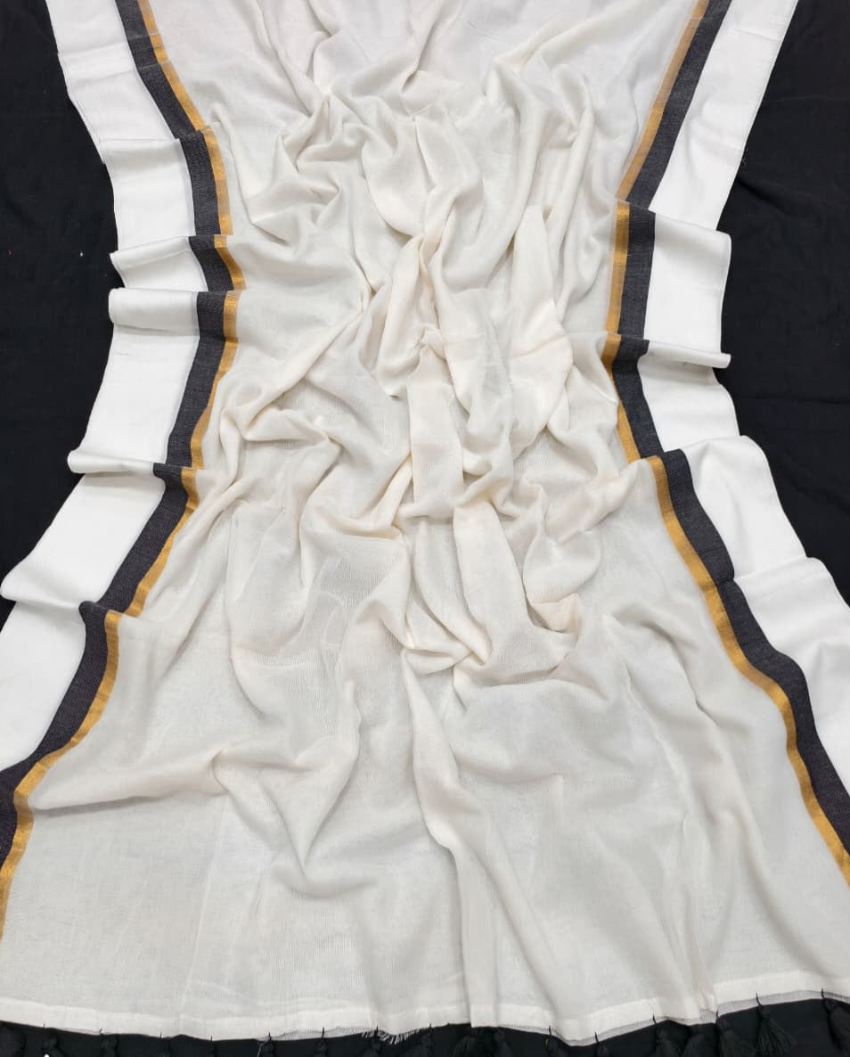 Experience the comfort of timeless elegance with our 140 Count Mulcotton Saree. This exquisite piece, crafted from exceptionally fine, breathable mulcotton, drapes beautifully and feels incredibly soft against the skin. The pristine off-white or cream body is perfectly accentuated by striking contrast borders featuring sophisticated stripes of black/charcoal and a hint of metallic gold/mustard. Lightweight and airy, this saree is ideal for daytime wear, casual gatherings, or as a sophisticated everyday staple. It embodies subtle luxury and effortless style.