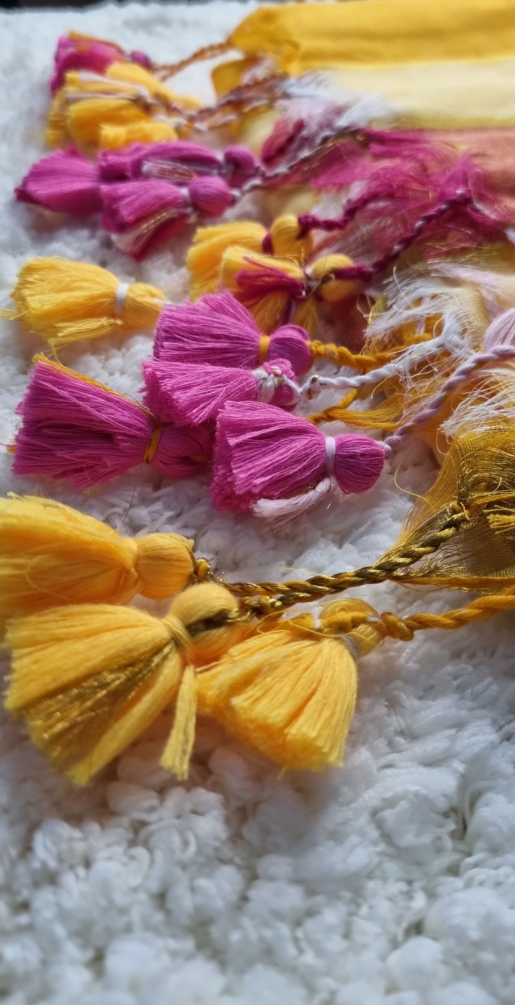 The soft, breathable Mulcotton fabric drapes beautifully, offering both comfort and style. Each broad stripe is elegantly defined by subtle shimmering gold lines, adding a festive and luxurious touch without being overpowering. The saree is finished with a thin metallic gold border and playful, colorful tassels on the pallu.