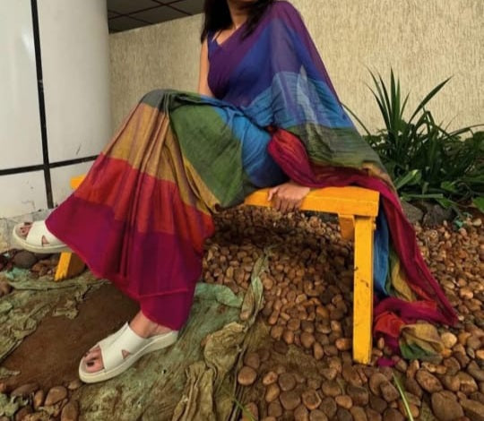 Celebrate color with this breathtaking Rainbow 100 Count Mulcotton Saree. Woven from finely spun, lightweight 100 count cotton, this saree promises a soft, breathable, and beautiful drape, making it an absolute delight to wear all day.