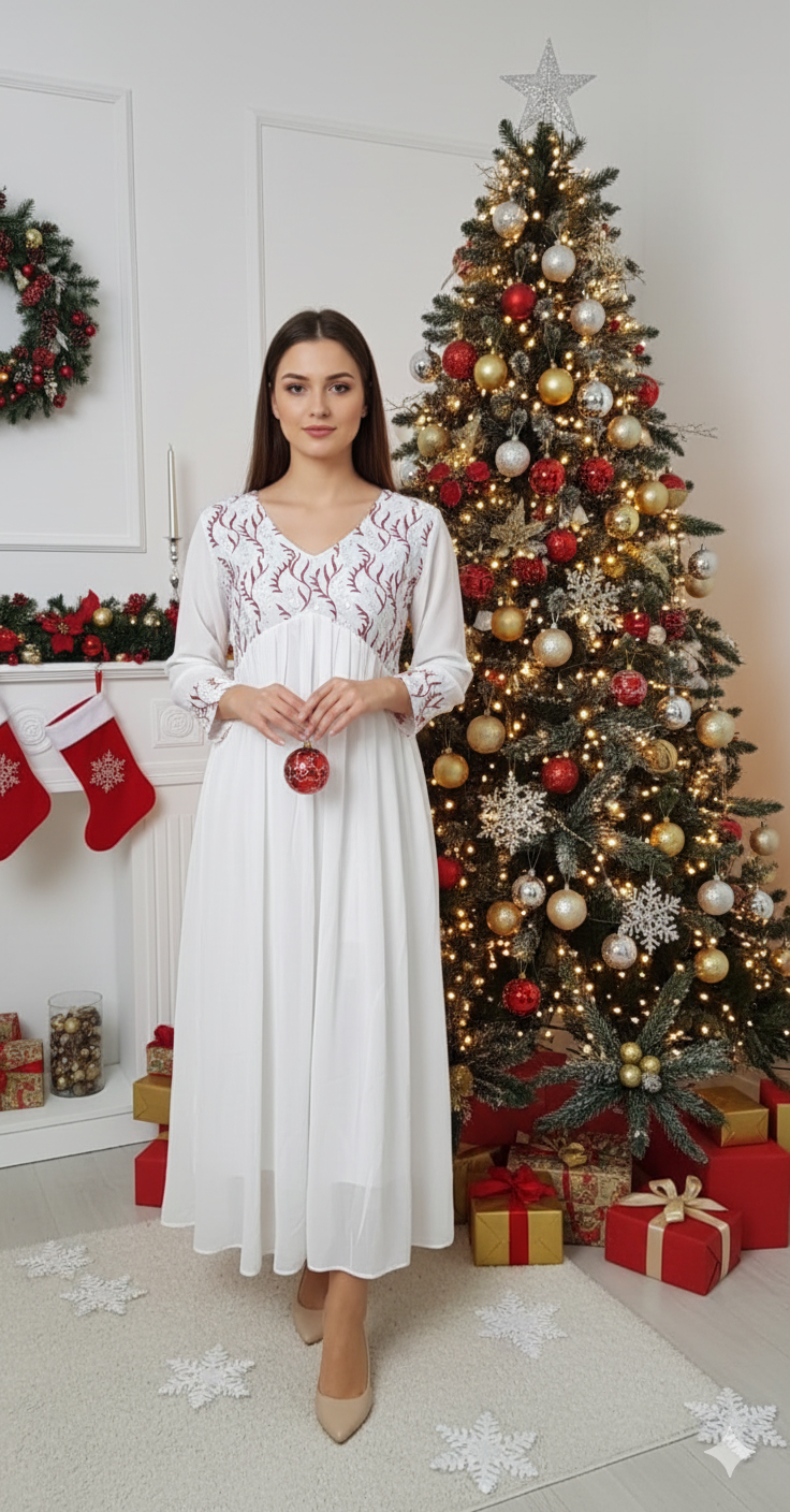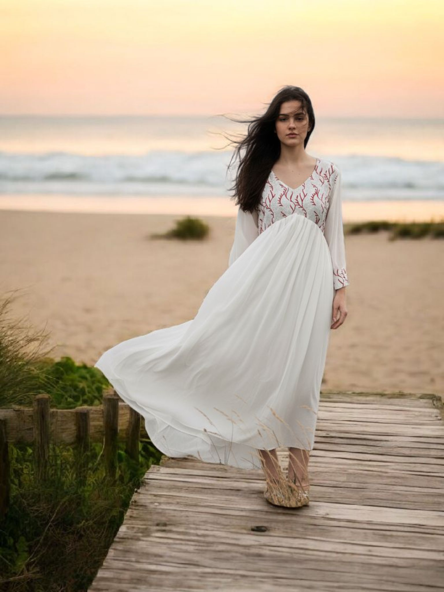 Flattering Details: Features a V-neckline and an elasticated or finely gathered waistline right below the yoke, ensuring a flattering, comfortable fit that flows beautifully into the skirt.