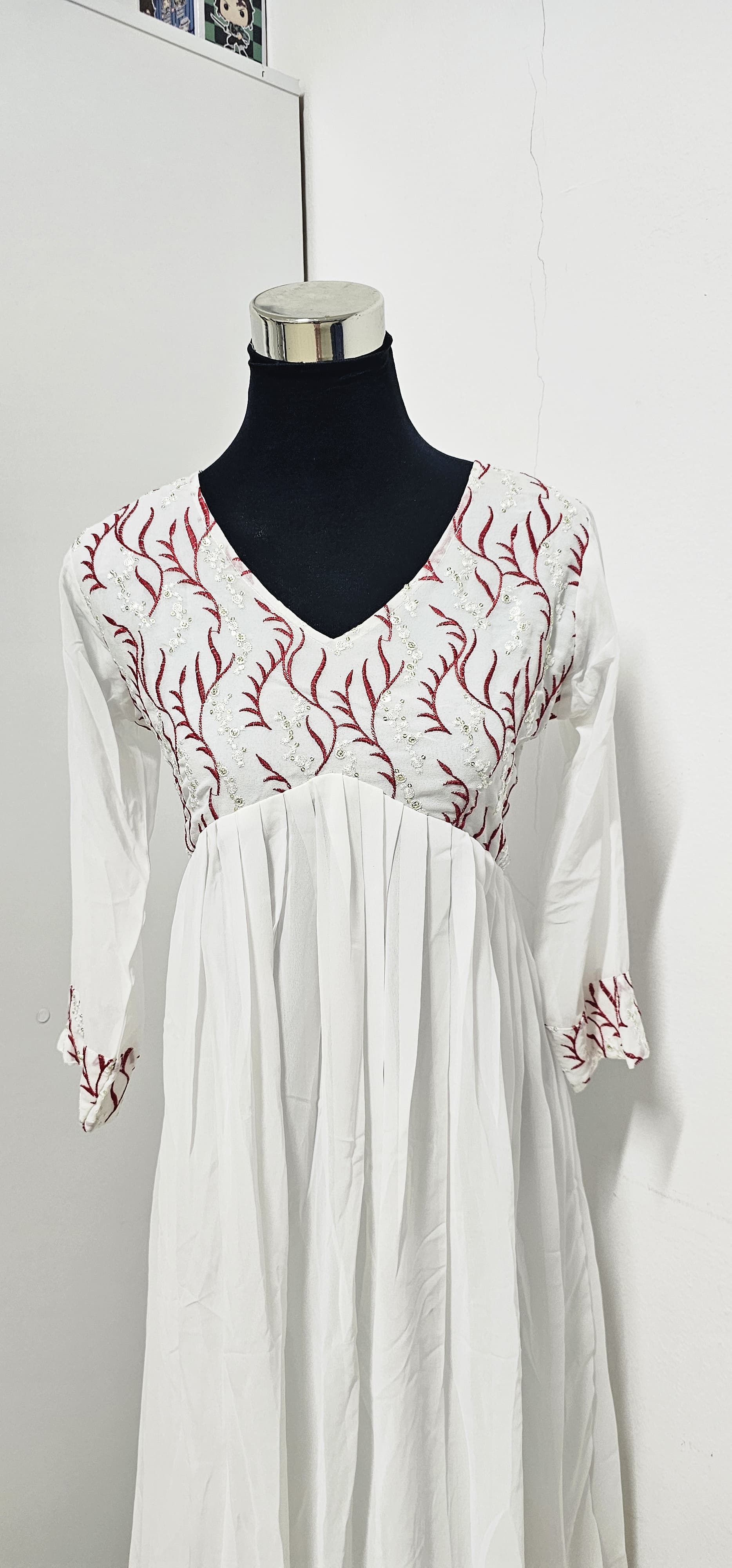Intricate Embroidery: The yoke and neckline feature delicate, contrast-colored (appears Maroon/Rust) thread embroidery in a captivating vine or coral pattern, adding a touch of sophisticated detail.